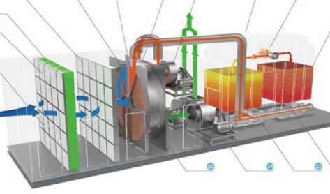 沸石轉輪濃縮部分依據功能分三個(gè)區,吸附區、脫附區、冷卻區。